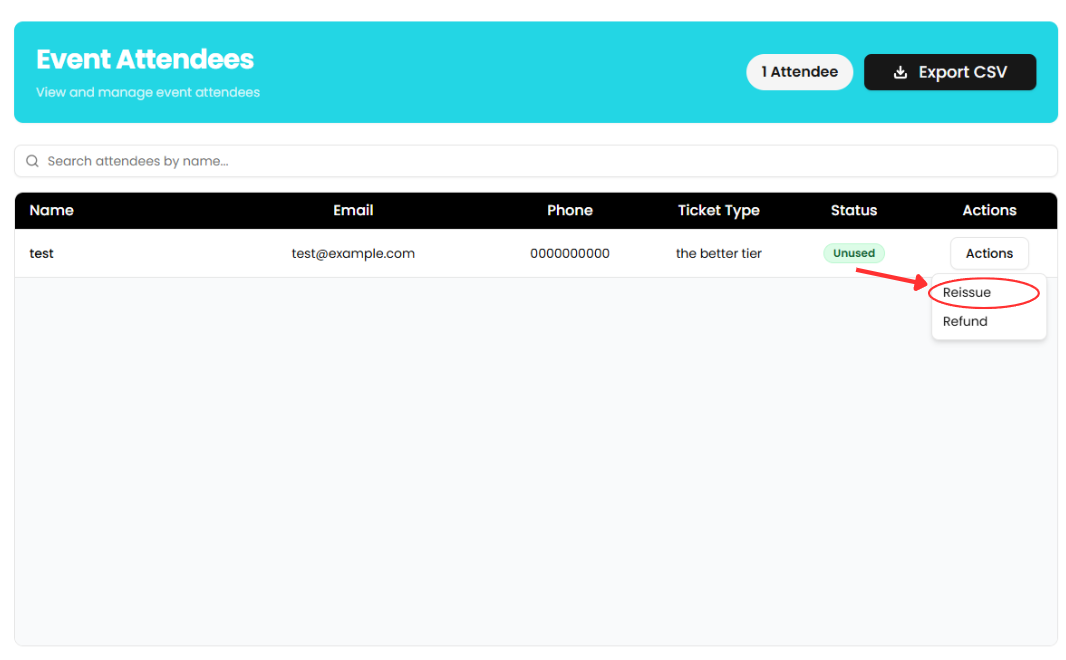 Select the Actions button, select Reissue from the dropdown and enter the attendee's email. Ensure that the email is spelled correctly, then press the Reissue Ticket button.