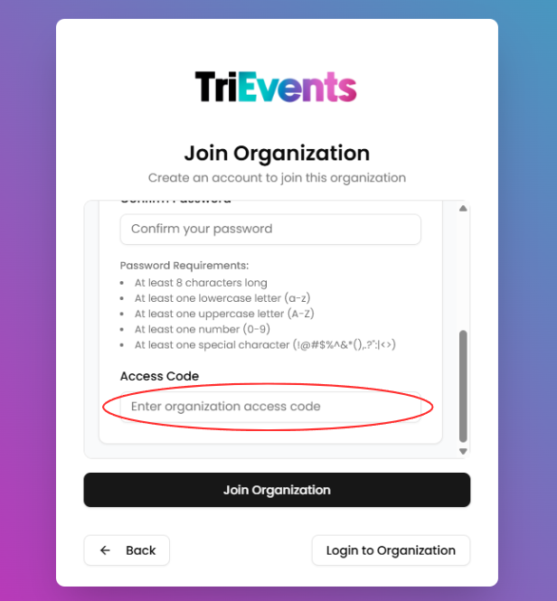 Provide the copied organization access code to any members you want to onboard into your organization.